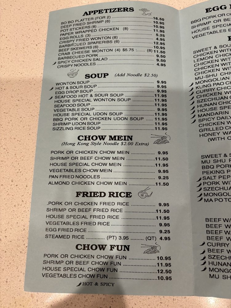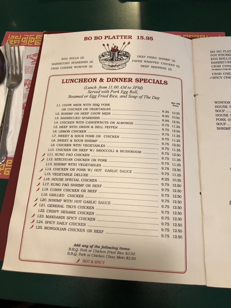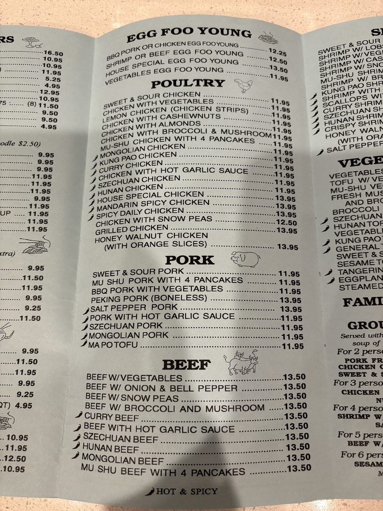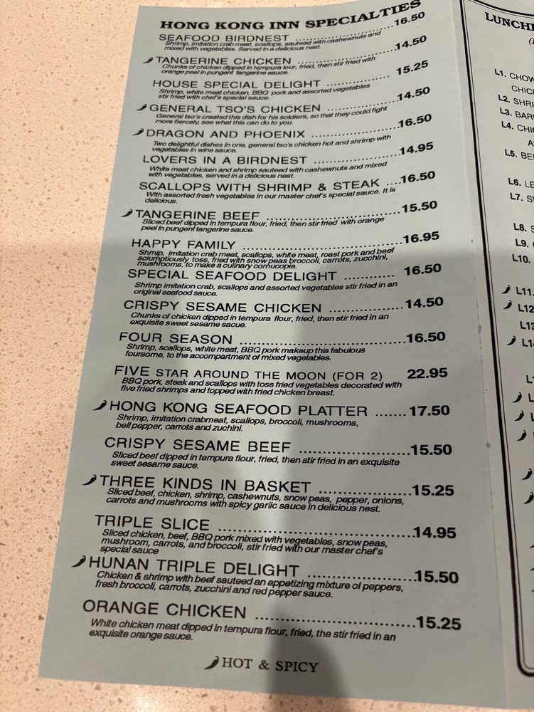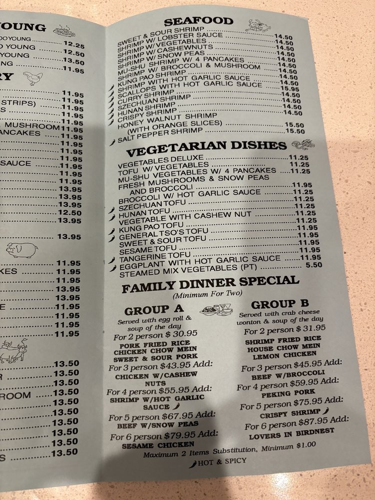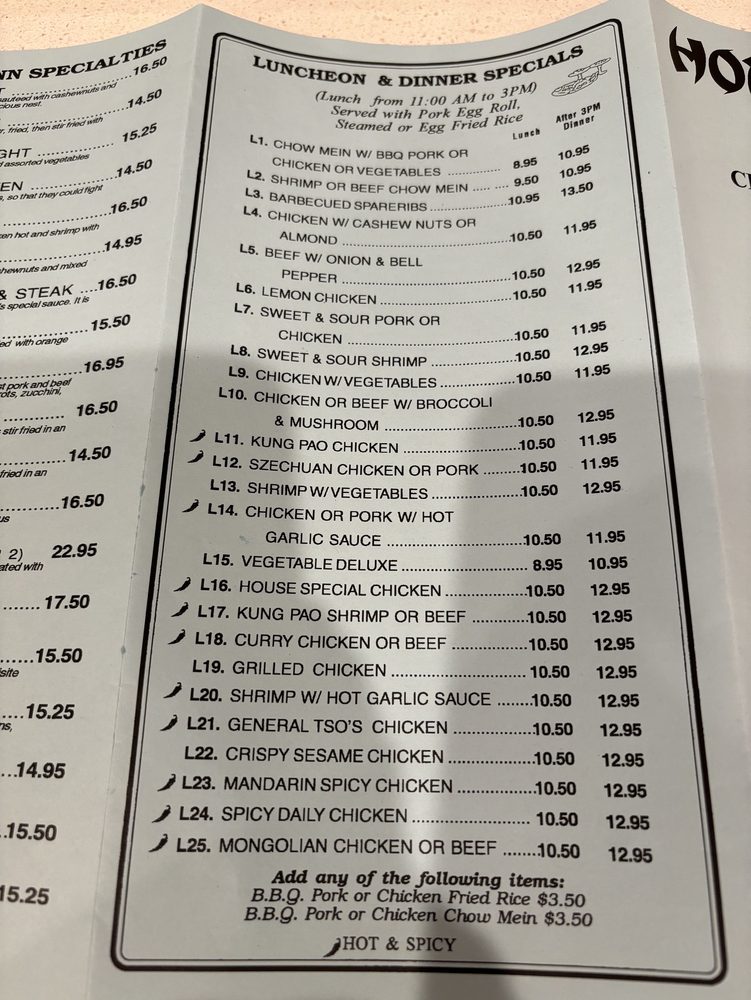 Hong Kong Inn, located in Placerville, CA, offers a wide range of Chinese dishes with many vegetarian options. The menu includes appetizers like Egg Roll and Fried Chicken Wings, as well as Egg Foo Young with various meat and vegetable options. Customers rave about the generous portion sizes and delicious flavors, with favorites like honey walnut shrimp and tangerine chicken. The restaurant prides itself on cooking without MSG and offers lunch and dinner specials daily. The clean and welcoming atmosphere, along with friendly service, make Hong Kong Inn a go-to spot for comfort Chinese food. Whether you're in the mood for a hearty meal or a quick takeout option, Hong Kong Inn delivers satisfying dishes at reasonable prices.